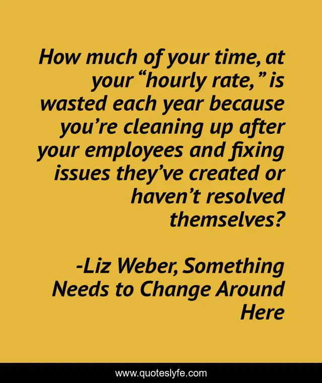 This page presents the quote "How much of your time, at your “hourly rate, ” is wasted each year because you’re cleaning up after your employees and fixing issues they’ve created or haven’t resolved themselves?". Author of this quote is Liz Weber, Something Needs to Change Around Here. This quote is about leadership-development-program, leadership,.