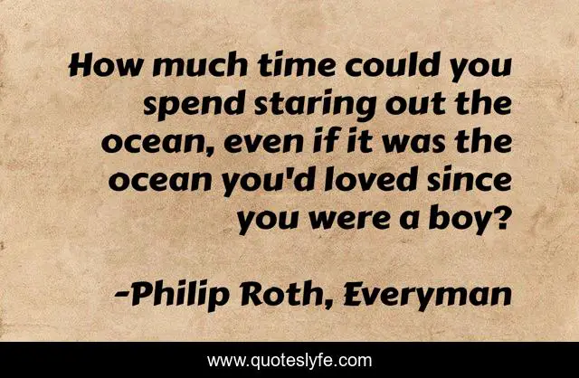 This page presents the quote "How much time could you spend staring out the ocean, even if it was the ocean you'd loved since you were a boy?". Author of this quote is Philip Roth, Everyman. This quote is about remembering, boyhood, childhood, ocean,.