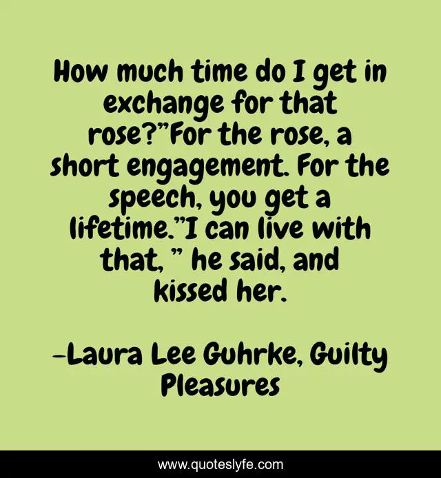 This page presents the quote "How much time do I get in exchange for that rose?”For the rose, a short engagement. For the speech, you get a lifetime.”I can live with that, ” he said, and kissed her.". Author of this quote is Laura Lee Guhrke, Guilty Pleasures. .