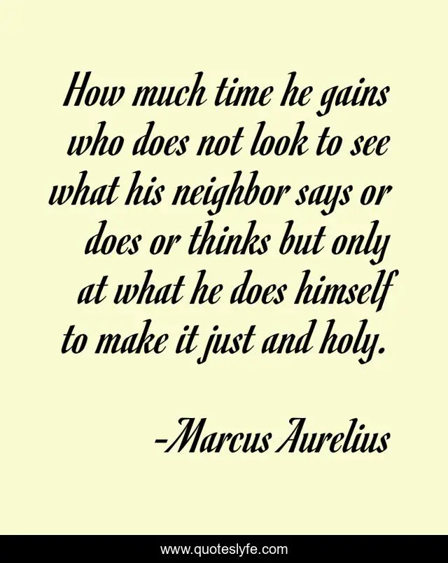 This page presents the quote "How much time he gains who does not look to see what his neighbor says or does or thinks but only at what he does himself to make it just and holy.". Author of this quote is Marcus Aurelius. This quote is about self, reliance,.