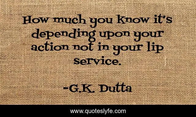 This page presents the quote "How much you know it’s depending upon your action not in your lip service.". Author of this quote is G.K. Dutta. This quote is about confidence, positive, motivational, leadership, optimistic, inspirational, enthusiasm,.
