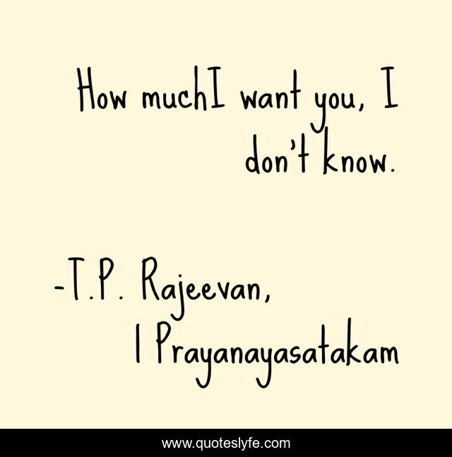 This page presents the quote "How muchI want you, I don't know.". Author of this quote is T.P. Rajeevan, പ്രണയശതകം | Prayanayasatakam. This quote is about romance, poem,.