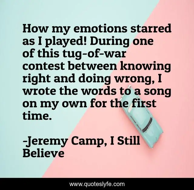 This page presents the quote "How my emotions starred as I played! During one of this tug-of-war contest between knowing right and doing wrong, I wrote the words to a song on my own for the first time.". Author of this quote is Jeremy Camp, I Still Believe. This quote is about discipleship, creativity, conviction, humility,.