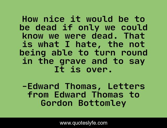 This page presents the quote "How nice it would be to be dead if only we could know we were dead. That is what I hate, the not being able to turn round in the grave and to say It is over.". Author of this quote is Edward Thomas, Letters from Edward Thomas to Gordon Bottomley. This quote is about ennui, death, life, dying, despair,.