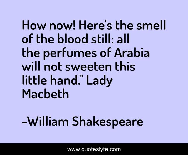 This page presents the quote "How now! Here's the smell of the blood still: all the perfumes of Arabia will not sweeten this little hand." Lady Macbeth". Author of this quote is William Shakespeare. .