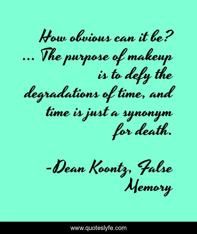 This page presents the quote "How obvious can it be? ... The purpose of makeup is to defy the degradations of time, and time is just a synonym for death.". Author of this quote is Dean Koontz, False Memory. This quote is about smug, death, makeup, time,.