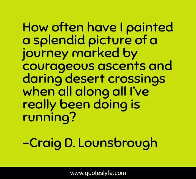 This page presents the quote "How often have I painted a splendid picture of a journey marked by courageous ascents and daring desert crossings when all along all I’ve really been doing is running?". Author of this quote is Craig D. Lounsbrough. This quote is about flee, lie, life, hide, deception, boasting, boast, spin, scared,.