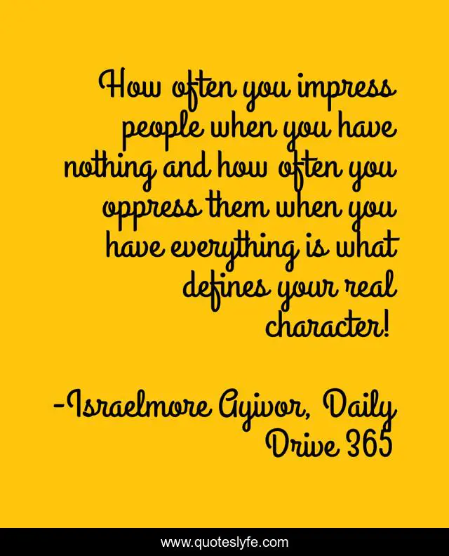 This page presents the quote "How often you impress people when you have nothing and how often you oppress them when you have everything is what defines your real character!". Author of this quote is Israelmore Ayivor, Daily Drive 365. This quote is about impression, food-for-thought, impressive, impress, oppression, character, behaviour, who-you-are, israelmore-ayivor,.