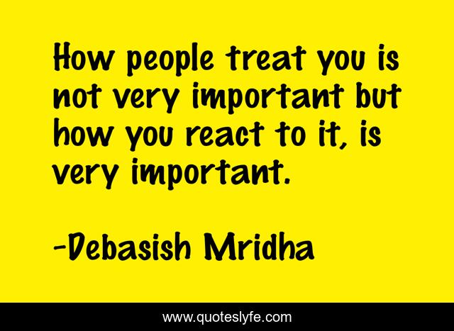This page presents the quote "How people treat you is not very important but how you react to it, is very important.". Author of this quote is Debasish Mridha. This quote is about life, debasish, people, mridha, philosophy, react, treat,.