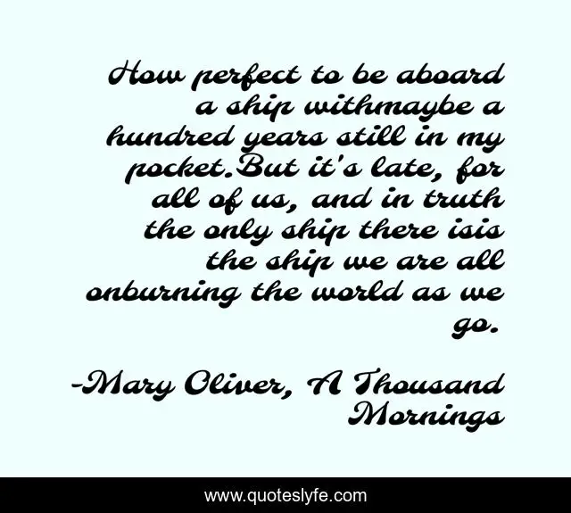 This page presents the quote "How perfect to be aboard a ship withmaybe a hundred years still in my pocket.But it's late, for all of us, and in truth the only ship there isis the ship we are all onburning the world as we go.". Author of this quote is Mary Oliver, A Thousand Mornings. This quote is about travel, time,.