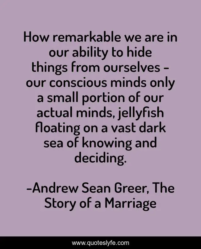 This page presents the quote "How remarkable we are in our ability to hide things from ourselves - our conscious minds only a small portion of our actual minds, jellyfish floating on a vast dark sea of knowing and deciding.". Author of this quote is Andrew Sean Greer, The Story of a Marriage. This quote is about secrets, hiding-things, mind, consciousness,.