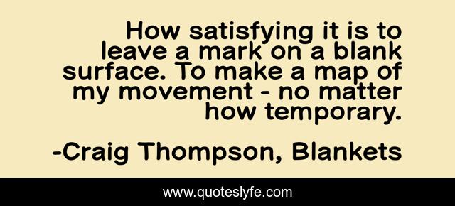 This page presents the quote "How satisfying it is to leave a mark on a blank surface. To make a map of my movement - no matter how temporary.". Author of this quote is Craig Thompson, Blankets. This quote is about enthusiasm, inspirational, profound,.