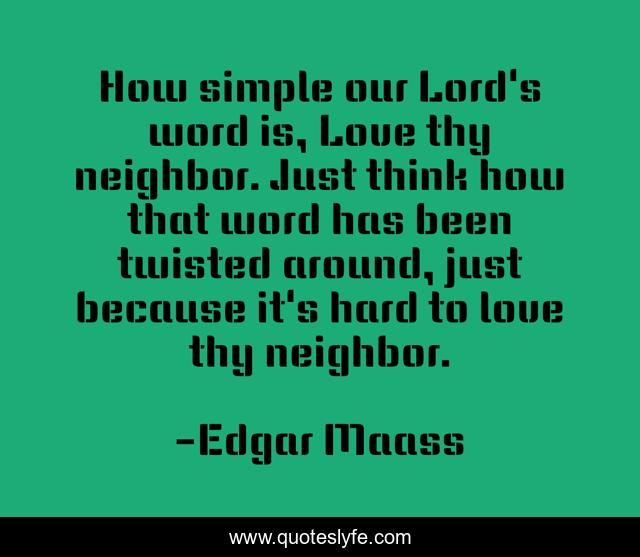 This page presents the quote "How simple our Lord's word is, Love thy neighbor. Just think how that word has been twisted around, just because it's hard to love thy neighbor.". Author of this quote is Edgar Maass. This quote is about god, christianity, spirituality, religion,.