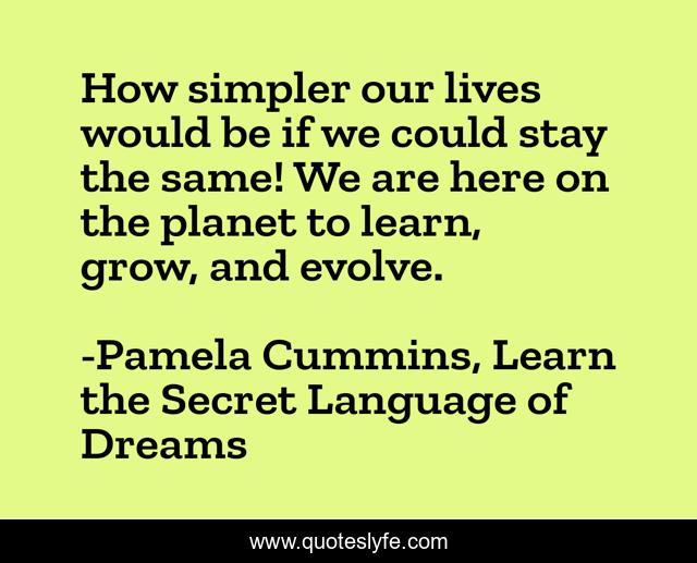 This page presents the quote "How simpler our lives would be if we could stay the same! We are here on the planet to learn, grow, and evolve.". Author of this quote is Pamela Cummins, Learn the Secret Language of Dreams. This quote is about self-growth, evolving, self-awareness, self-improvement, self-growth-and-improvement,.
