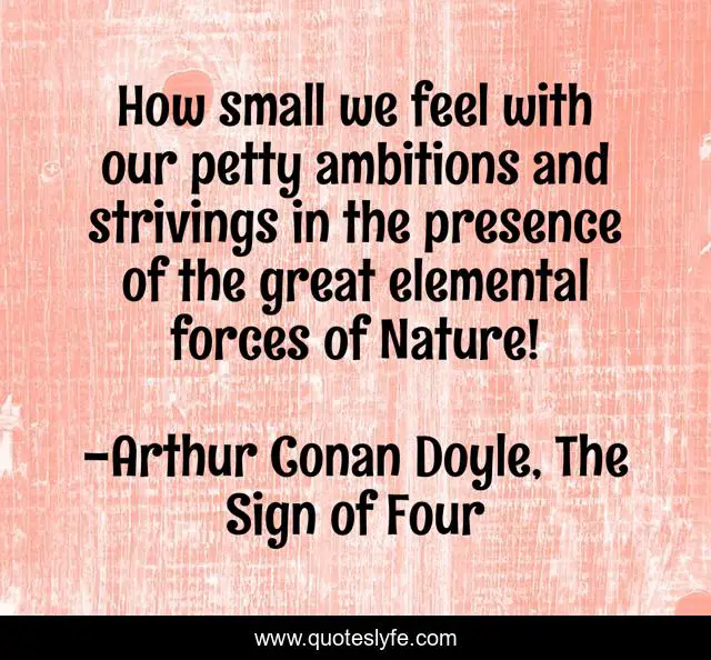This page presents the quote "How small we feel with our petty ambitions and strivings in the presence of the great elemental forces of Nature!". Author of this quote is Arthur Conan Doyle, The Sign of Four. This quote is about perspective, nature,.