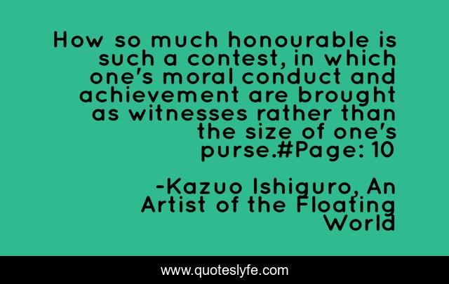 This page presents the quote "How so much honourable is such a contest, in which one's moral conduct and achievement are brought as witnesses rather than the size of one's purse.#Page: 10". Author of this quote is Kazuo Ishiguro, An Artist of the Floating World. .
