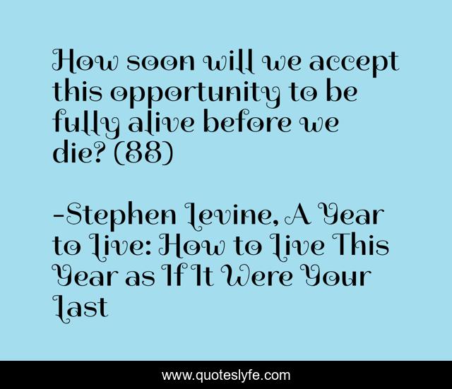This page presents the quote "How soon will we accept this opportunity to be fully alive before we die? (88)". Author of this quote is Stephen Levine, A Year to Live: How to Live This Year as If It Were Your Last. This quote is about living, life, death, dying, acceptance, opportunity,.