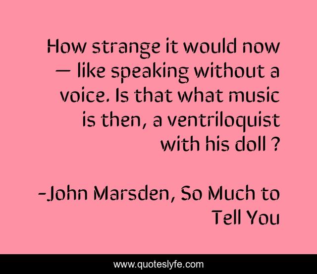 This page presents the quote "How strange it would now — like speaking without a voice. Is that what music is then, a ventriloquist with his doll ?". Author of this quote is John Marsden, So Much to Tell You. This quote is about voice, music,.
