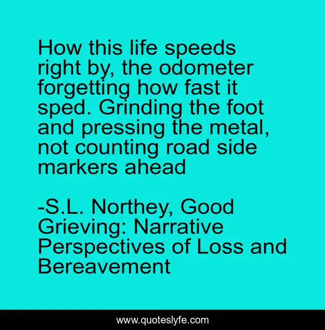 This page presents the quote "How this life speeds right by, the odometer forgetting how fast it sped. Grinding the foot and pressing the metal, not counting road side markers ahead". Author of this quote is S.L. Northey, Good Grieving: Narrative Perspectives of Loss and Bereavement. .