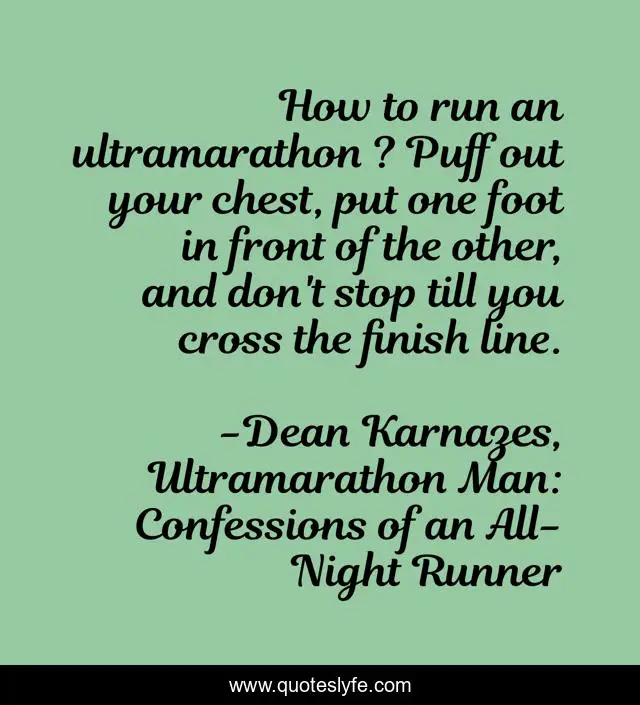 This page presents the quote "How to run an ultramarathon ? Puff out your chest, put one foot in front of the other, and don't stop till you cross the finish line.". Author of this quote is Dean Karnazes, Ultramarathon Man: Confessions of an All-Night Runner. .