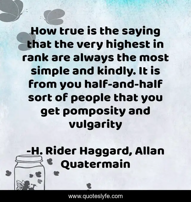 This page presents the quote "How true is the saying that the very highest in rank are always the most simple and kindly. It is from you half-and-half sort of people that you get pomposity and vulgarity". Author of this quote is H. Rider Haggard, Allan Quatermain. This quote is about vulgarity, true, pomposity,.