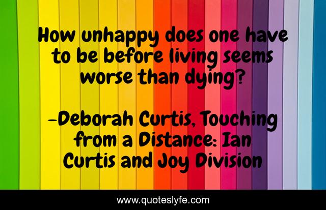 This page presents the quote "How unhappy does one have to be before living seems worse than dying?". Author of this quote is Deborah Curtis, Touching from a Distance: Ian Curtis and Joy Division. This quote is about living, life, suicide, suicidal, joy-division, death,.