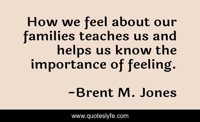 This page presents the quote "How we feel about our families teaches us and helps us know the importance of feeling.". Author of this quote is Brent M. Jones. This quote is about families, families-teach-us, feelings,.