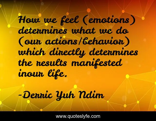 This page presents the quote "How we feel (emotions) determines what we do (our actions/behavior) which directly determines the results manifested inour life.". Author of this quote is Derric Yuh Ndim. This quote is about personal-development, our-actions, self-help,.