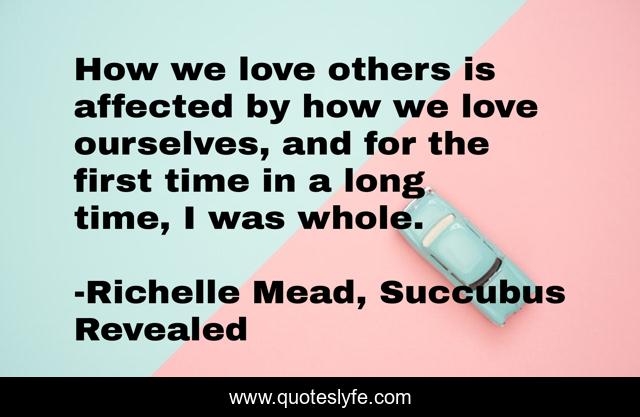 This page presents the quote "How we love others is affected by how we love ourselves, and for the first time in a long time, I was whole.". Author of this quote is Richelle Mead, Succubus Revealed. This quote is about love, self-confidence, affection,.