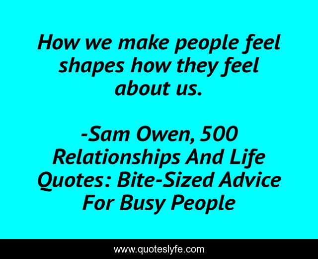 "Sam Owen, 500 Relationships And Life Quotes: Bite-Sized Advice For Busy People Quotes." Quoteslyfe.com, 2025. Fri. 05 Dec. 2025. <https://www.quoteslyfe.com/quote/How-we-make-people-feel-shapes-how-35765>.
