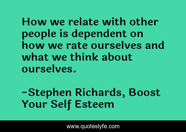 This page presents the quote "How we relate with other people is dependent on how we rate ourselves and what we think about ourselves.". Author of this quote is Stephen Richards, Boost Your Self Esteem. This quote is about wealth-creation, money, mind-body-spirit, optimistic, self-help, confidence, wealth, self-help-book, positive,.