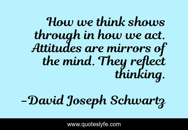 This page presents the quote "How we think shows through in how we act. Attitudes are mirrors of the mind. They reflect thinking.". Author of this quote is David Joseph Schwartz. This quote is about thinking, mind, think,.