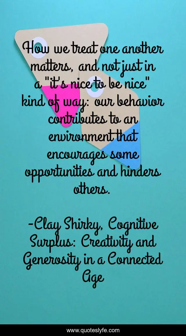 This page presents the quote "How we treat one another matters, and not just in a "it's nice to be nice" kind of way: our behavior contributes to an environment that encourages some opportunities and hinders others.". Author of this quote is Clay Shirky, Cognitive Surplus: Creativity and Generosity in a Connected Age. This quote is about encouragement, community, opportunities, value,.