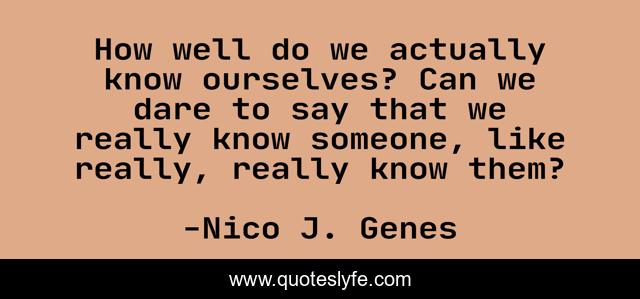 This page presents the quote "How well do we actually know ourselves? Can we dare to say that we really know someone, like really, really know them?". Author of this quote is Nico J. Genes. This quote is about relationships, life, knowing-someone, love, knowing-others, knowing-who-you-are, other-people, knowing-oneself, others,.