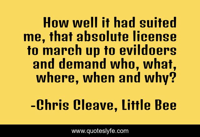 This page presents the quote "How well it had suited me, that absolute license to march up to evildoers and demand who, what, where, when and why?". Author of this quote is Chris Cleave, Little Bee. This quote is about journalism, journalists,.