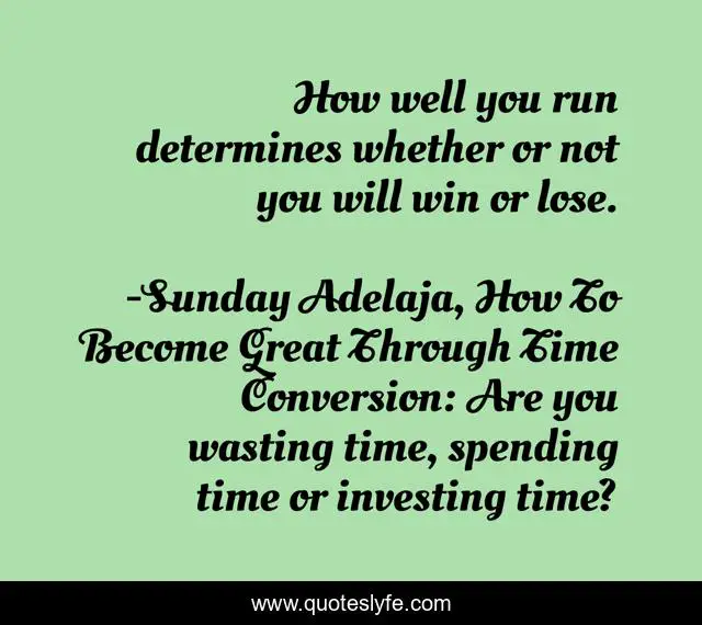 This page presents the quote "How well you run determines whether or not you will win or lose.". Author of this quote is Sunday Adelaja, How To Become Great Through Time Conversion: Are you wasting time, spending time or investing time?. This quote is about humanity, great, waste, productivity, wealth, gift, work, life, convert,.