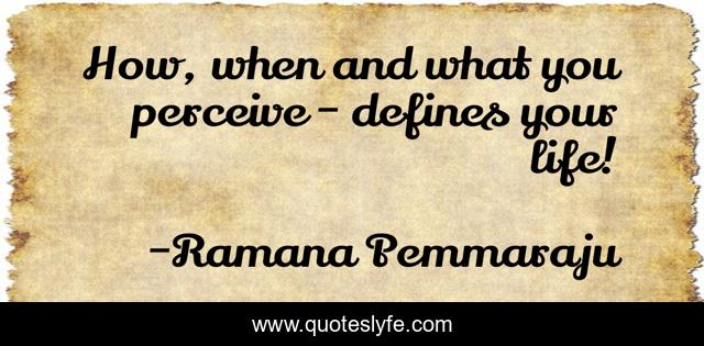 This page presents the quote "How, when and what you perceive - defines your life!". Author of this quote is Ramana Pemmaraju. This quote is about individuality, perception, introspection, life-philosophy, define, personality,.