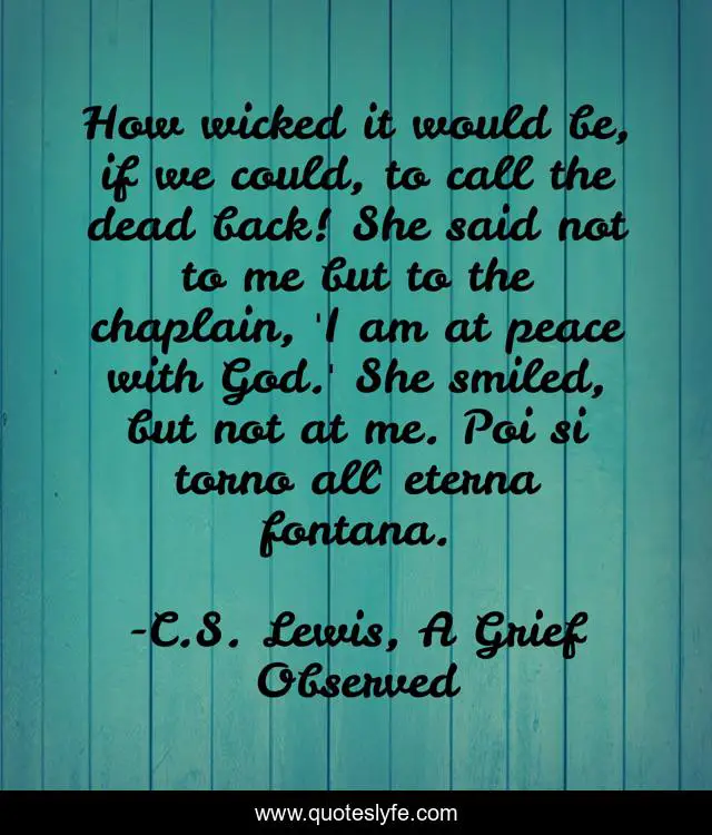 This page presents the quote "How wicked it would be, if we could, to call the dead back! She said not to me but to the chaplain, 'I am at peace with God.' She smiled, but not at me. Poi si torno all' eterna fontana.". Author of this quote is C.S. Lewis, A Grief Observed. This quote is about loved-ones, death, heaven,.