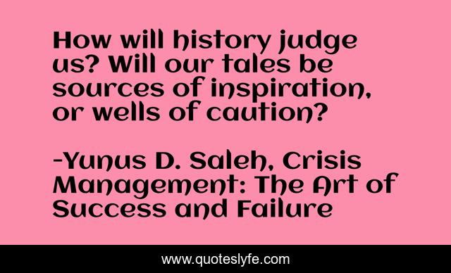 This page presents the quote "How will history judge us? Will our tales be sources of inspiration, or wells of caution?". Author of this quote is Yunus D. Saleh, Crisis Management: The Art of Success and Failure. This quote is about problem-solving, management, business, decision-making, history,.