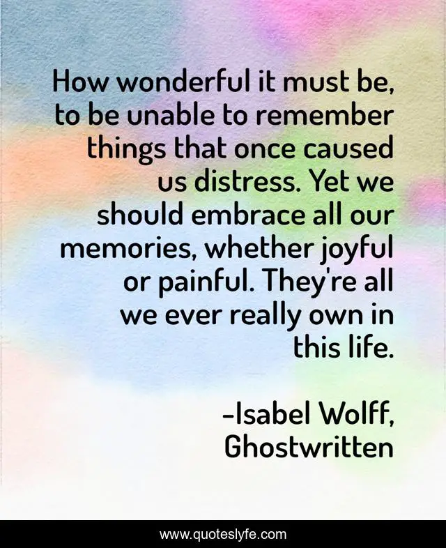 This page presents the quote "How wonderful it must be, to be unable to remember things that once caused us distress. Yet we should embrace all our memories, whether joyful or painful. They're all we ever really own in this life.". Author of this quote is Isabel Wolff, Ghostwritten. .