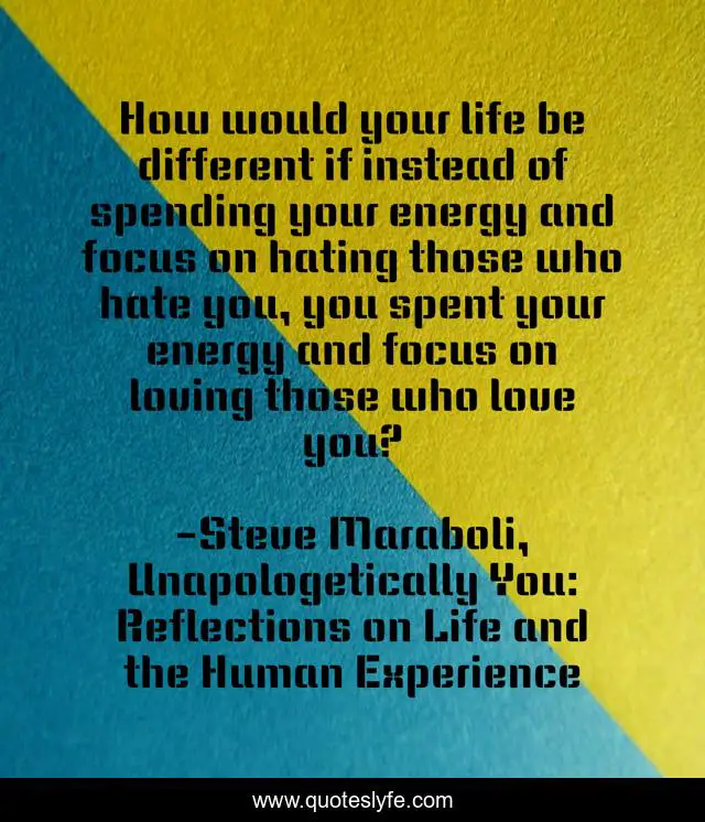 This page presents the quote "How would your life be different if instead of spending your energy and focus on hating those who hate you, you spent your energy and focus on loving those who love you?". Author of this quote is Steve Maraboli, Unapologetically You: Reflections on Life and the Human Experience. This quote is about life, lovers, love, energy, hating, hate, affection,.