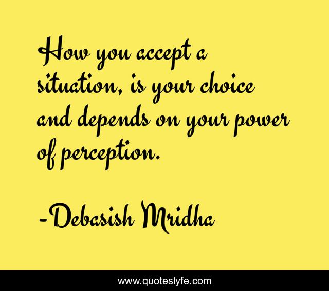This page presents the quote "How you accept a situation, is your choice and depends on your power of perception.". Author of this quote is Debasish Mridha. This quote is about life, love, knowledge, inspirational, intelligence, philosophy, wisdom, quotes, affection,.