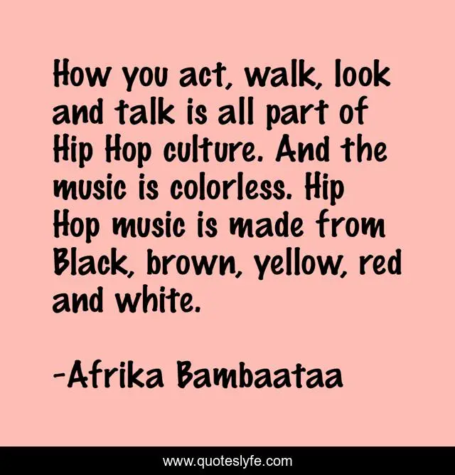 This page presents the quote "How you act, walk, look and talk is all part of Hip Hop culture. And the music is colorless. Hip Hop music is made from Black, brown, yellow, red and white.". Author of this quote is Afrika Bambaataa. This quote is about culture, red, walk,.