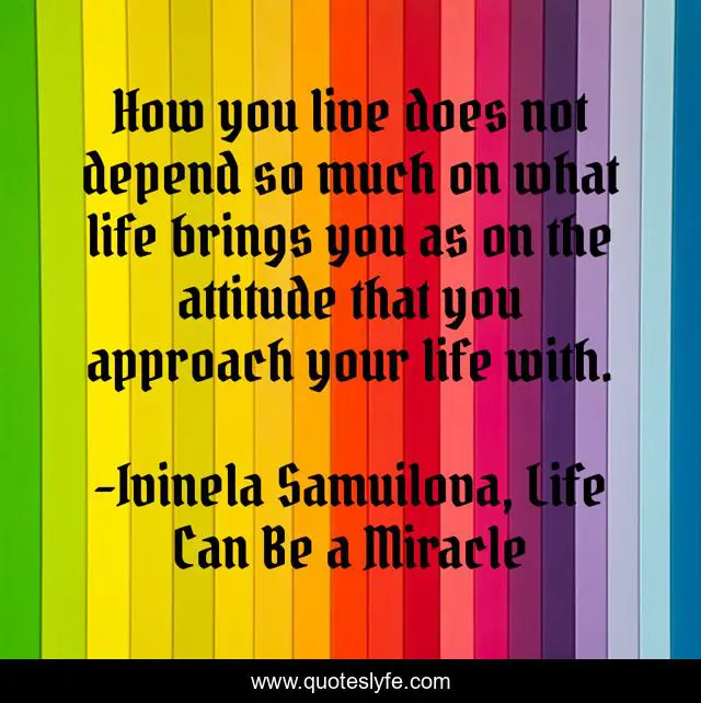 This page presents the quote "How you live does not depend so much on what life brings you as on the attitude that you approach your life with.". Author of this quote is Ivinela Samuilova, Life Can Be a Miracle. This quote is about attitude-toward-life, life-experience, inspirational, enthusiasm,.