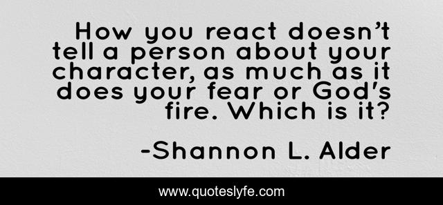 This page presents the quote "How you react doesn’t tell a person about your character, as much as it does your fear or God's fire. Which is it?". Author of this quote is Shannon L. Alder. This quote is about confidence, fear-or-spirit, god-s-warrior,.