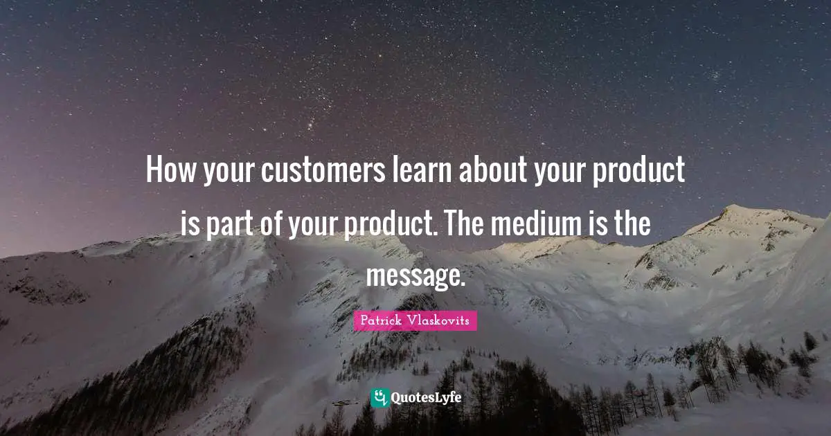 This page presents the quote "How your customers learn about your product is part of your product. The medium is the message.". Author of this quote is Patrick Vlaskovits. This quote is about mediums, messages, customers,.