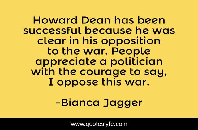 This page presents the quote "Howard Dean has been successful because he was clear in his opposition to the war. People appreciate a politician with the courage to say, I oppose this war.". Author of this quote is Bianca Jagger. This quote is about successful, war, people,.