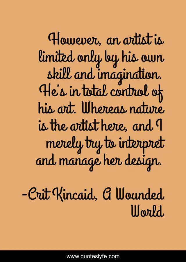 This page presents the quote "However, an artist is limited only by his own skill and imagination. He’s in total control of his art. Whereas nature is the artist here, and I merely try to interpret and manage her design.". Author of this quote is Crit Kincaid, A Wounded World. This quote is about art, nature,.