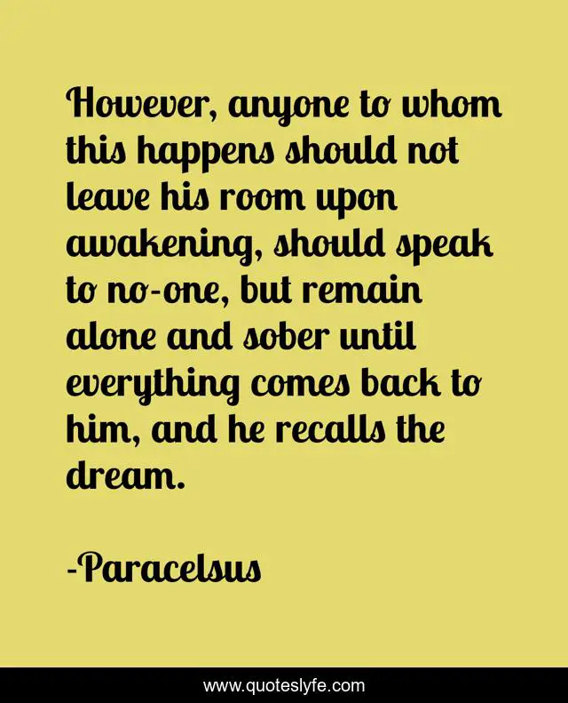 This page presents the quote "However, anyone to whom this happens should not leave his room upon awakening, should speak to no-one, but remain alone and sober until everything comes back to him, and he recalls the dream.". Author of this quote is Paracelsus. This quote is about dream, back, speak,.