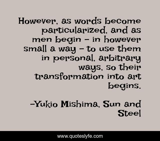 This page presents the quote "However, as words become particularized, and as men begin - in however small a way - to use them in personal, arbitrary ways, so their transformation into art begins.". Author of this quote is Yukio Mishima, Sun and Steel. This quote is about art, words,.